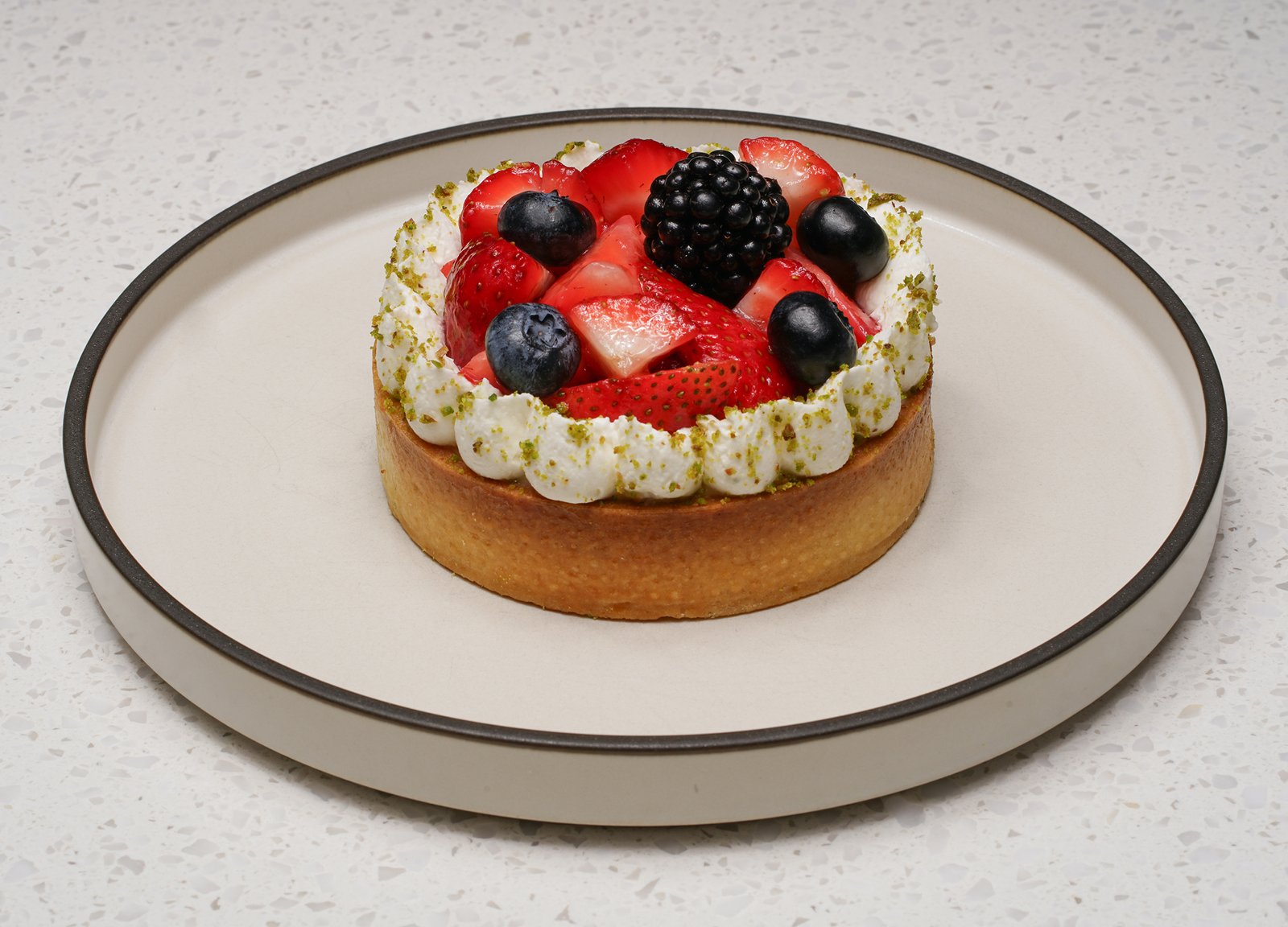 Golden tart shell topped with fresh, seasonal berries. Contains almond.