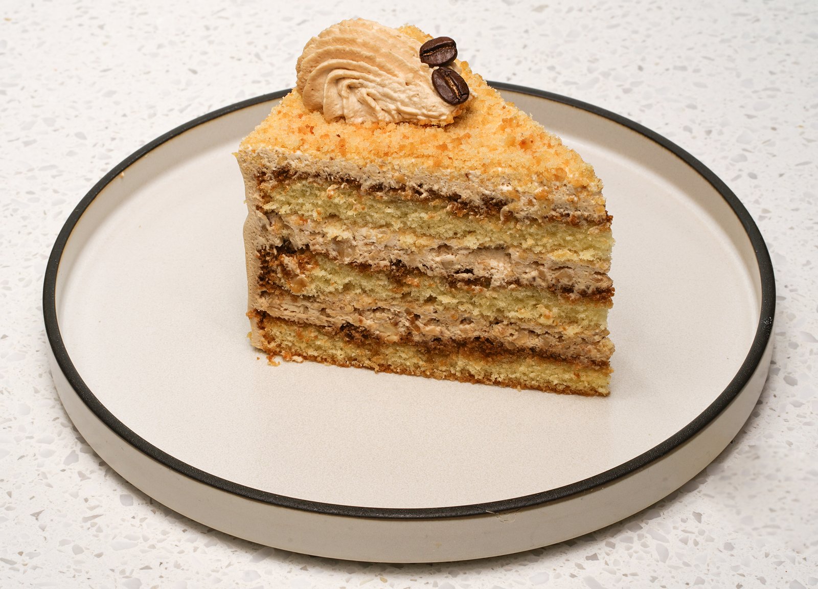 Caramel mousse layered with walnut sponge. Contains walnut.