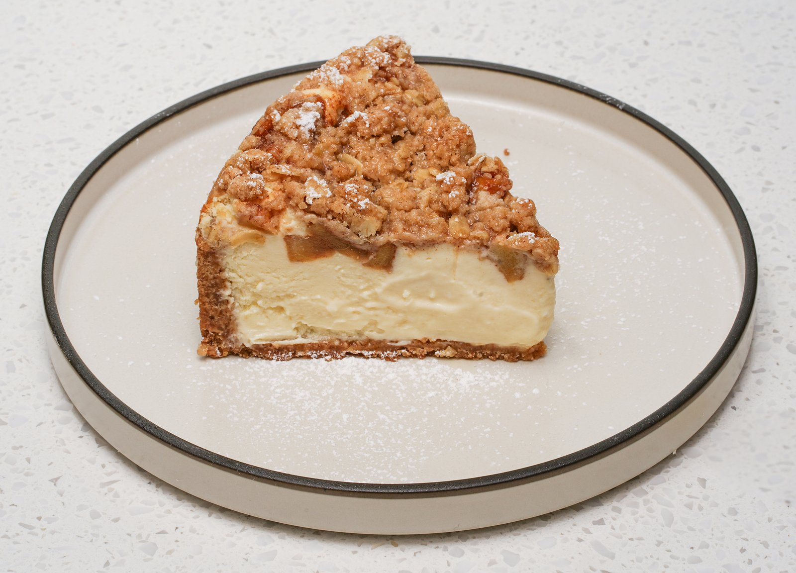 Creamy cheesecake topped with cinnamon apples and oat crumble.