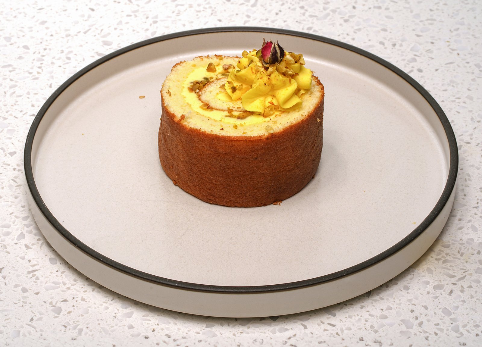 Soft cake rolled with saffron cream and crushed pistachios. Contains pistachio.