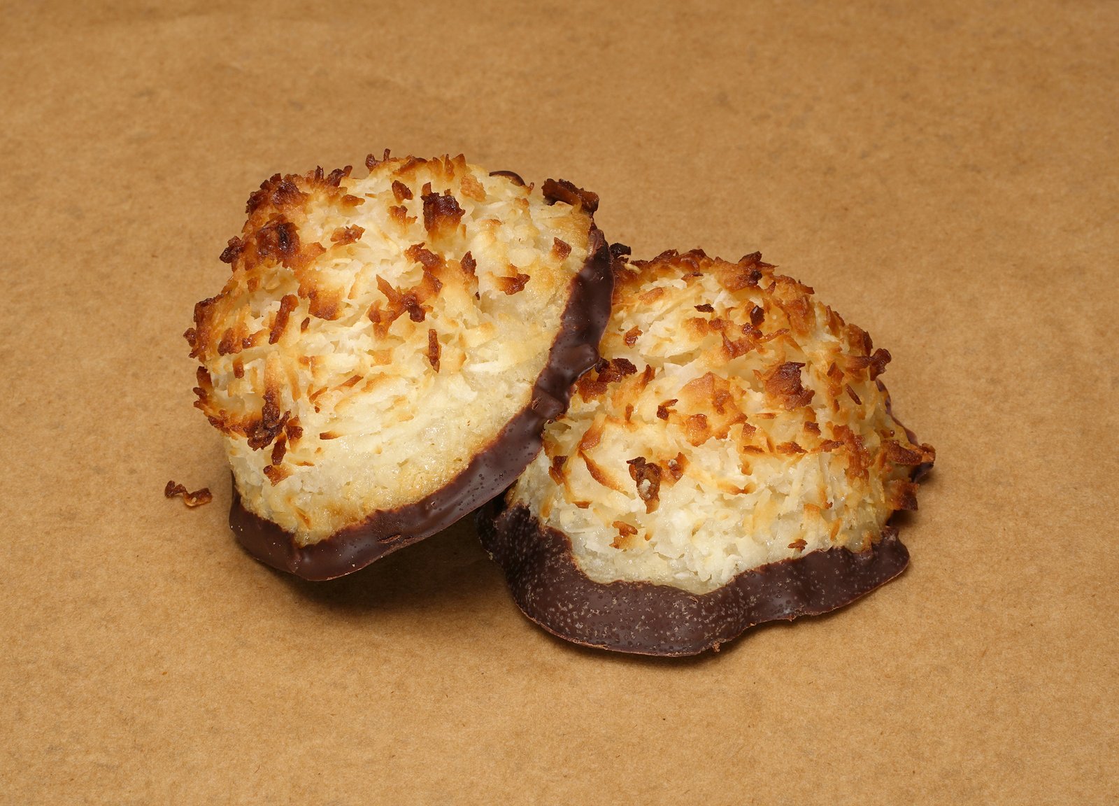 Sweet, chewy coconut macaroon with chocolate.