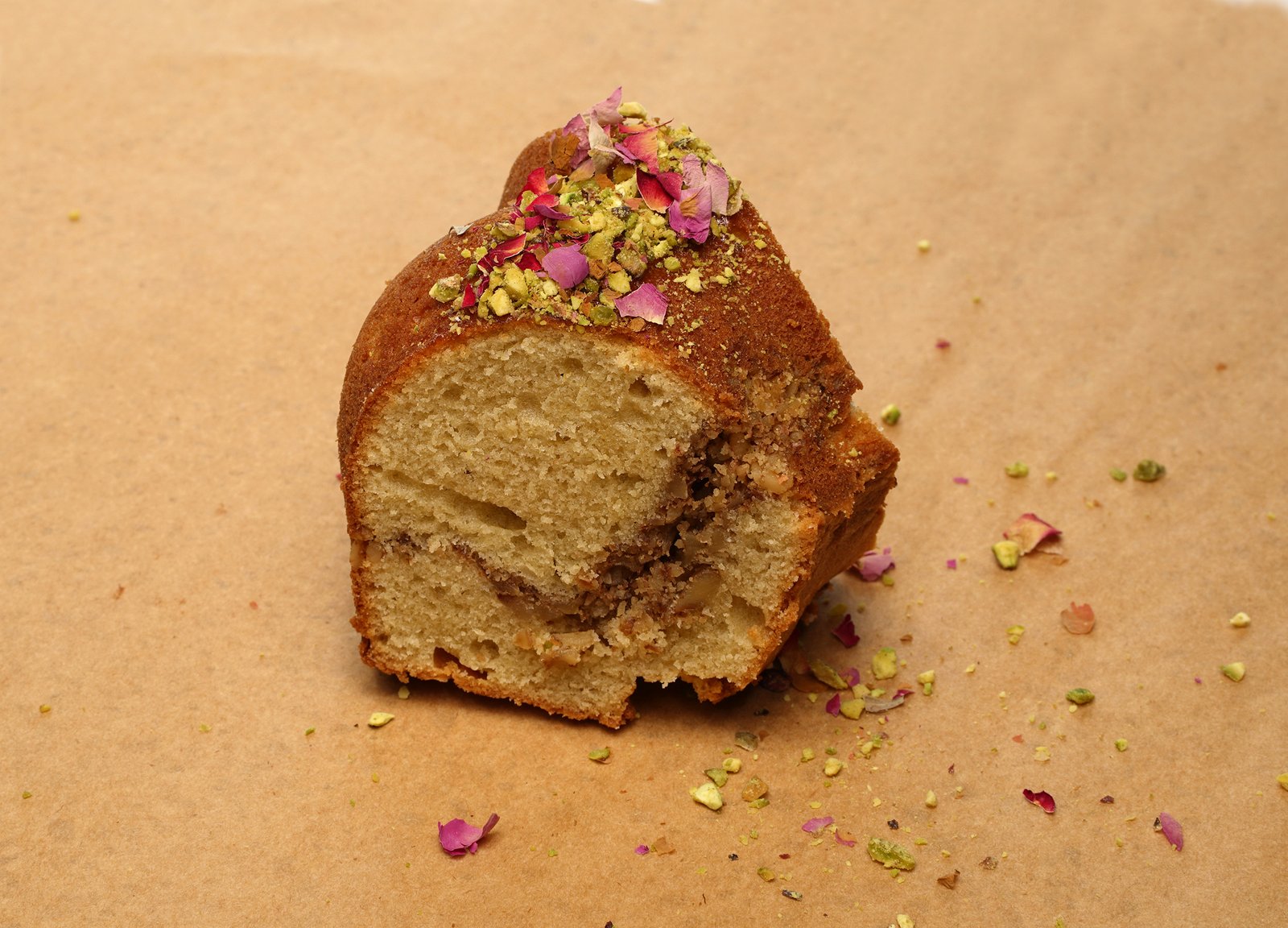 Moist coffee and cardamom bundt cake. Contains walnut and pistachio.
