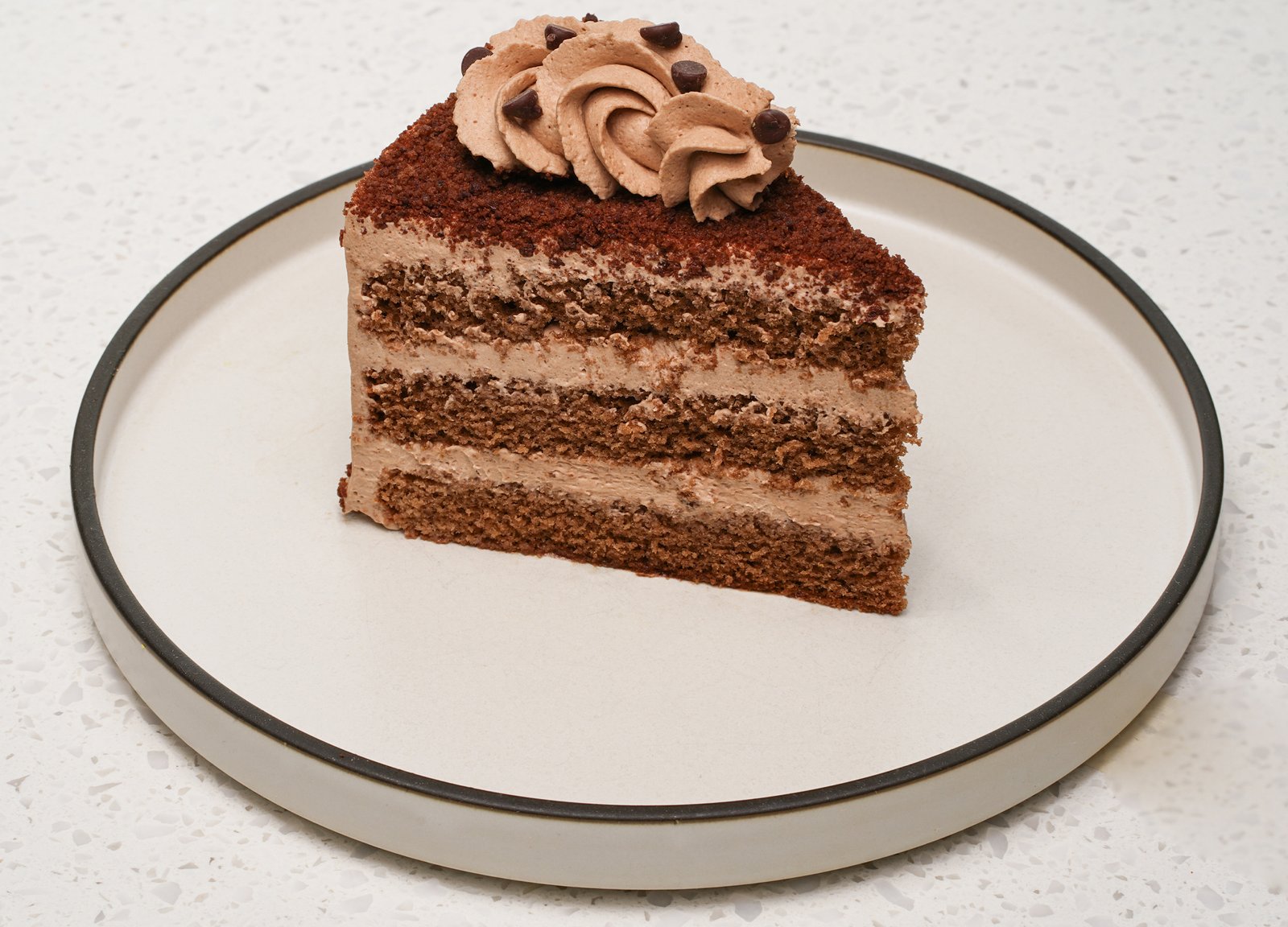 Layers of chocolate mousse, sponge and silky glaze.