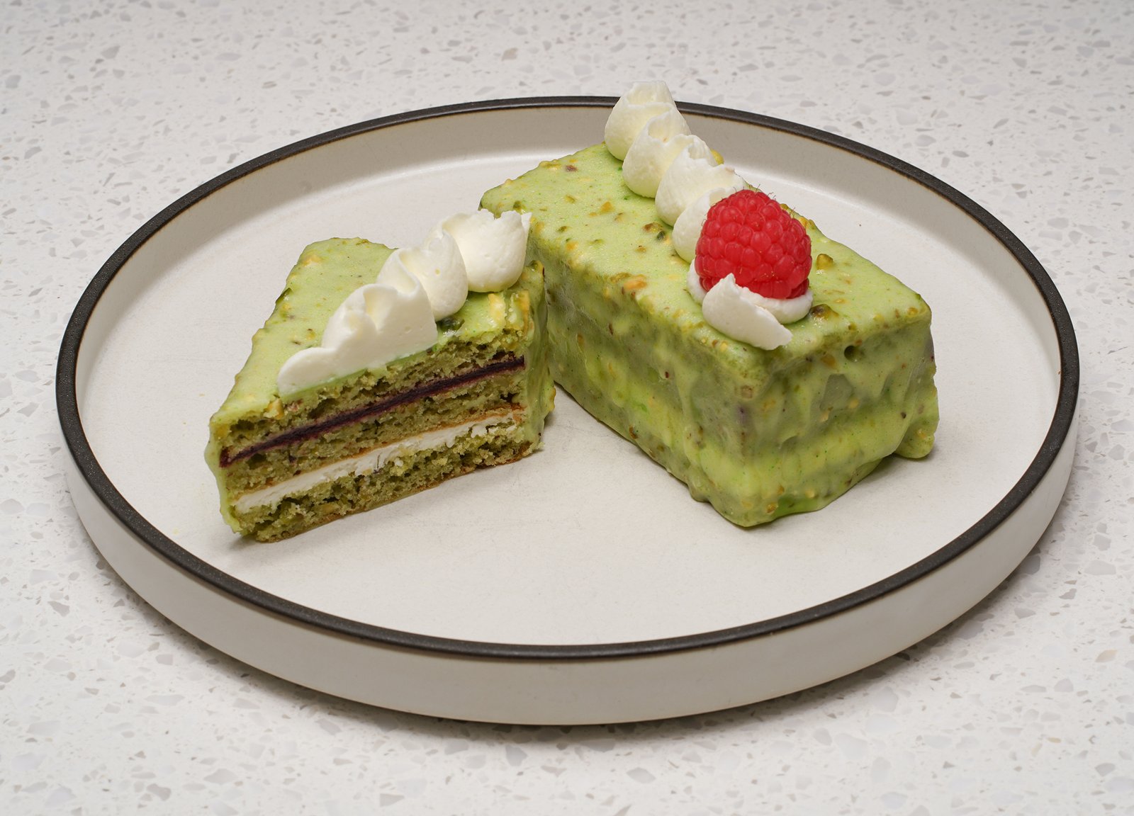 Layers of pistachio sponge, cheesy cream and berry jam. Contains almond, pistachio.